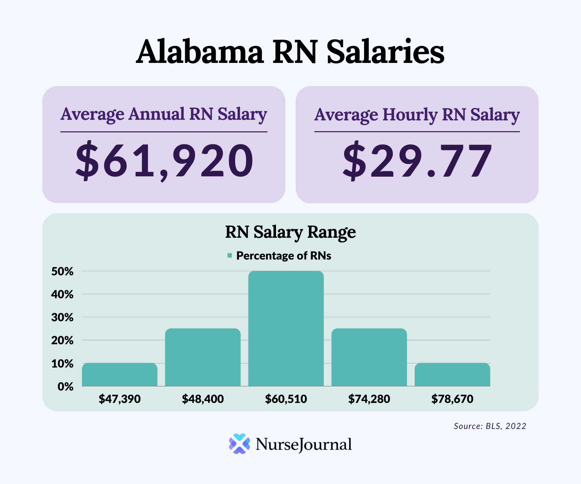 When working toward becoming an RN, being aware of the compensation within each state helps nurses determine the location that works best. According to the Bureau of Labor and Statistics (BLS), the average annual salary for RNs in Alabama is $61,920 ($29.77 per hour), compared to the national average of $82,750.