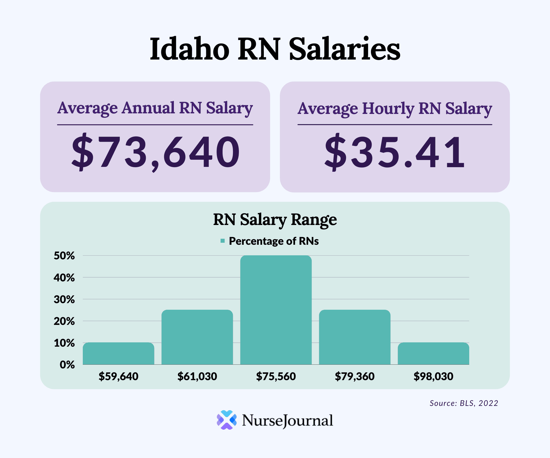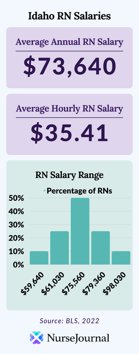 - Average Idaho RN Salary: $73,640 (Ranks 28th among all states)