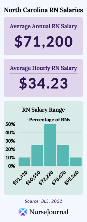 Over 100,000 RNs work in the Tar Heel state. A registered nurse salary in North Carolina is an annual median of $72,220, or an average hourly wage of $34.72.