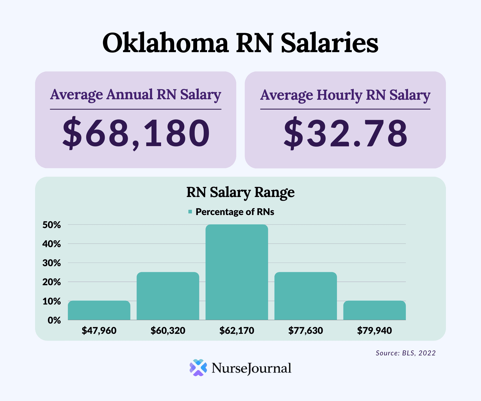 - Average Oklahoma RN Salary: $68,180 (Ranks 41st among all states)